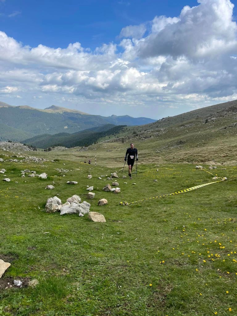 I reach a grassy clearing with more hill but set a mental goal to get to the next bit of forest high above. More forest, then I arrive above the forest. I’m met with a beautiful grassy meadow with buttercups and small purple flowers. Views of Romania. Huge swathes of farms and rocky mountain tops. Its beautiful. But I don’t gaze too long. I’m terrified of heights so want to focus on the job in hand. I sit down and take a gel. I have been so pre-occupied with marching I’m yet to take on board food but I feel good.