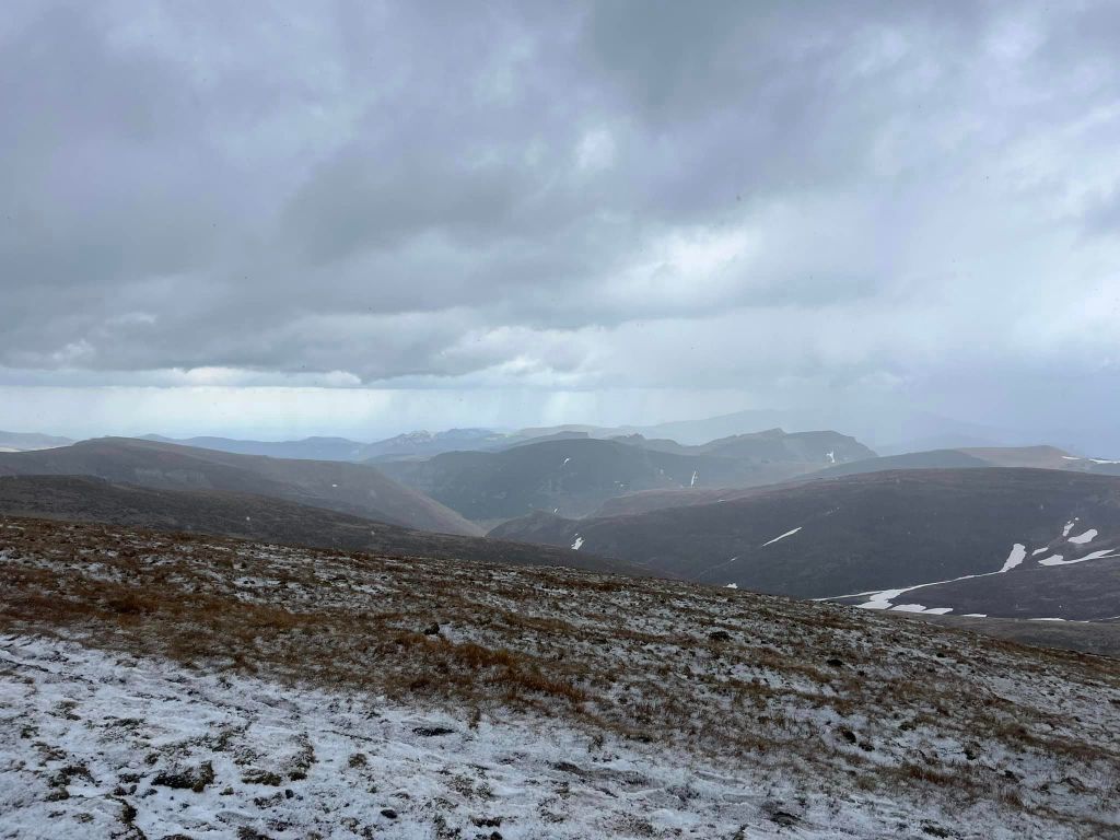 I trotted through the snow and ice more to warm up than anything. The mountain plateau was much flatter. Little vegetation. When I reached telecom masts and a building I knew I must be at the highest point. Then people were running and the guy from near home came by saying checkpoint is near. Rolling hills, hail, snow, mud, cold. It didn’t feel near… I was scared. The path was difficult to follow. There were fewer and fewer people. It was misty. The sky was rumbling.